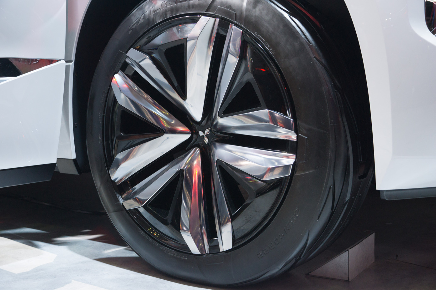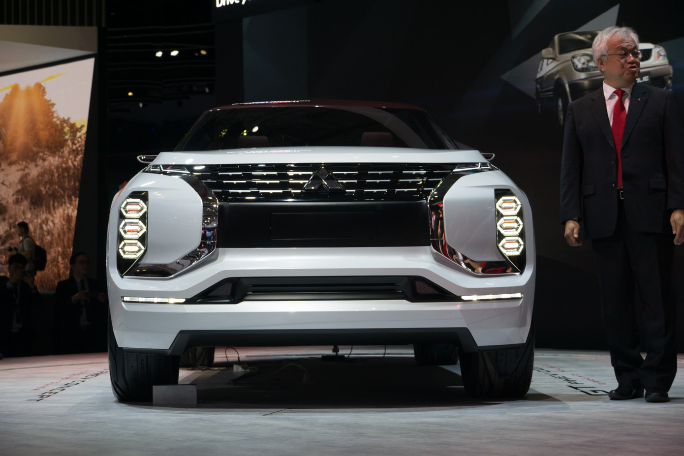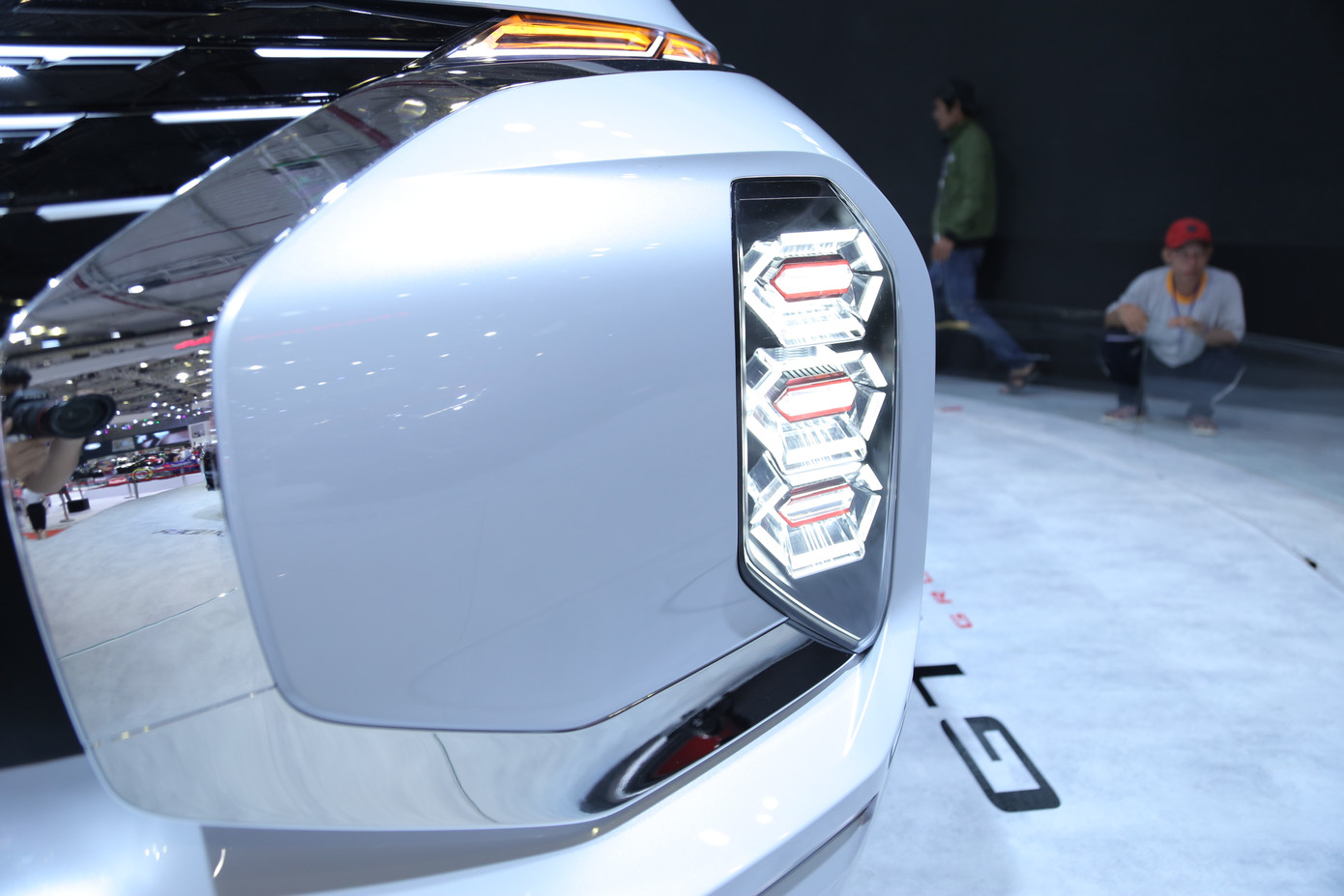 Phần đầu của concept GT-PHEV mang những dấu ấn đậm nét của Mitsubishi với ngôn ngữ thiết kế Dynamic Shield. Điểm nhấn của mặt ca-lăng là rất nhiều chi tiết mạ Chrome sáng bóng.