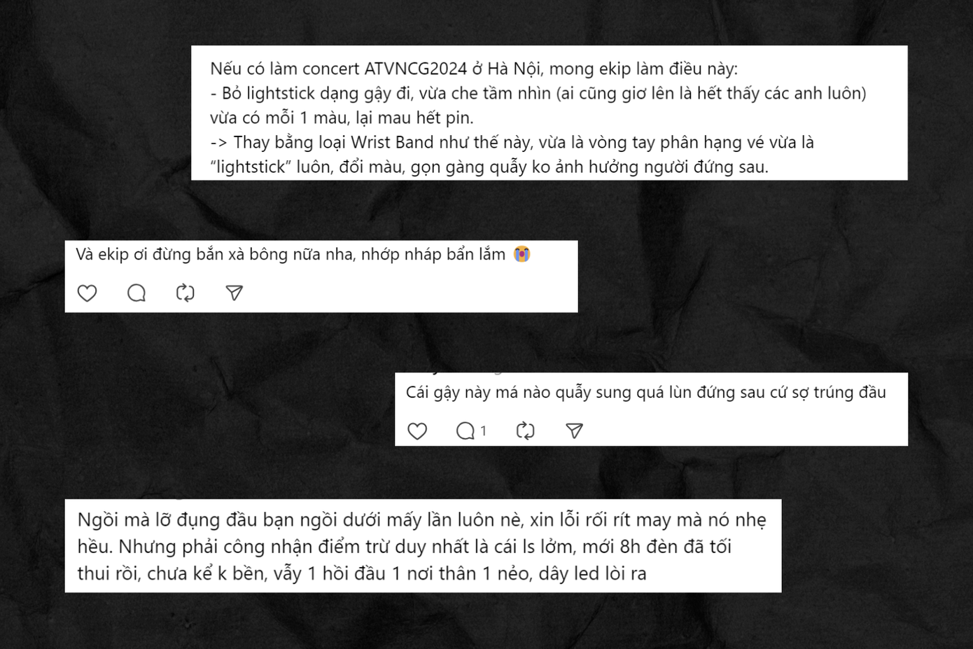 Ngoài ra, đề xuất thay đổi thiết kế lightstick từ dạng gậy sang vòng tay tích hợp đổi màu đang nhận được nhiều sự ủng hộ. Khán giả cho rằng điều này sẽ giúp cải thiện tầm nhìn và mang lại trải nghiệm tốt hơn cho những buổi diễn sau này.