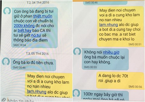 Đến khoảng 19 giờ 34 cùng ngày, anh Dũng nhận được tin nhắn từ số máy lạ với nội dung: “Con ông bà đang bị tui giữ ở Phan Thiết. Muốn chuộc con về chuẩn bị 200 triệu, không được nói cho ai biết hay báo CA (công an) thì tui sẽ giết nó, sẽ thông báo địa điểm sau”. Ngay sau đó, anh Dũng vội vàng đến trụ sở Công an H.Tuy Phong trình báo.