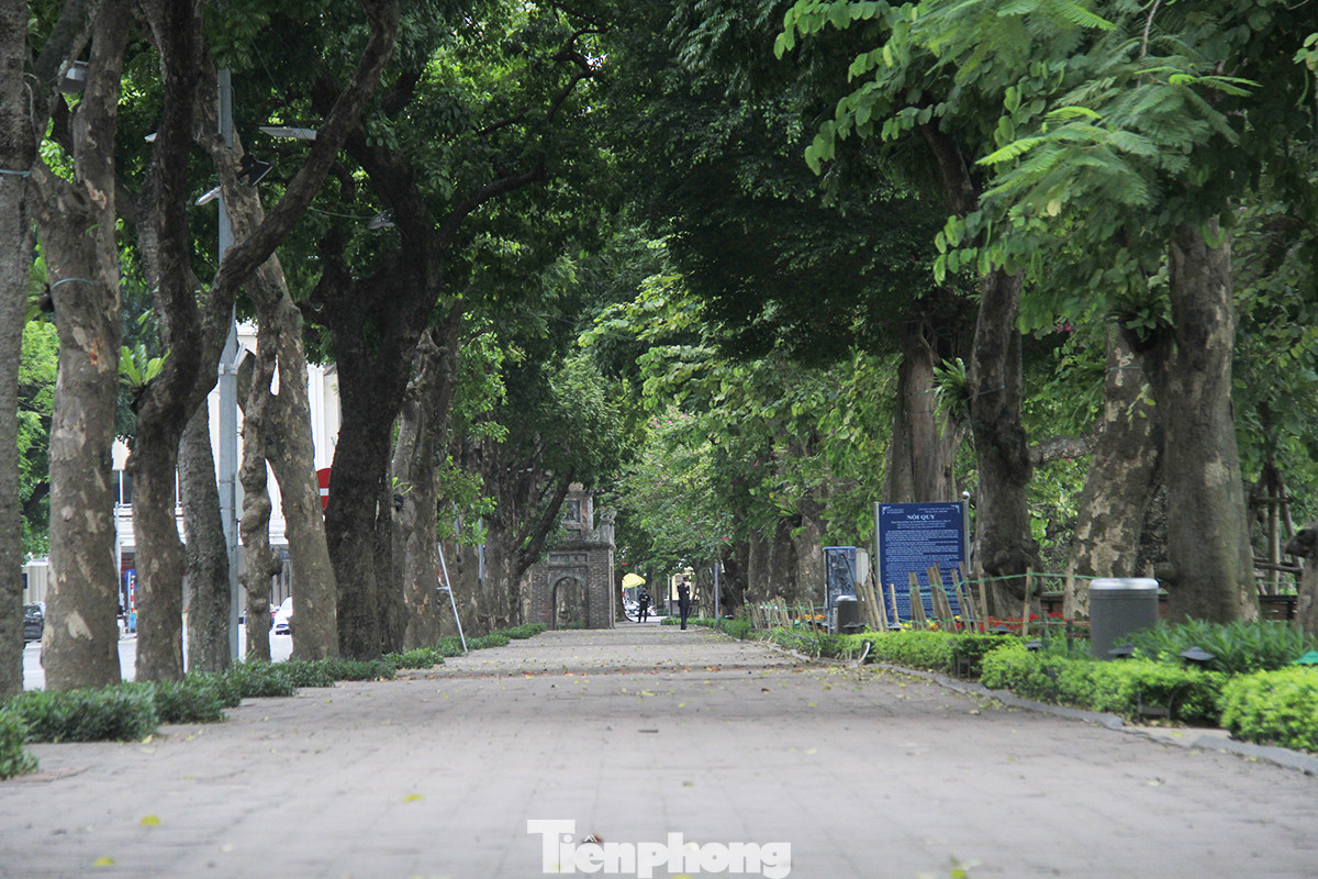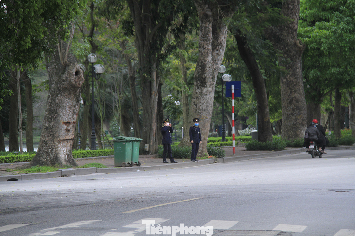 Xung quanh hồ Gươm, chỉ thấy bóng của các chiến sĩ công an, dân phòng, lực lượng bảo vệ bờ hồ