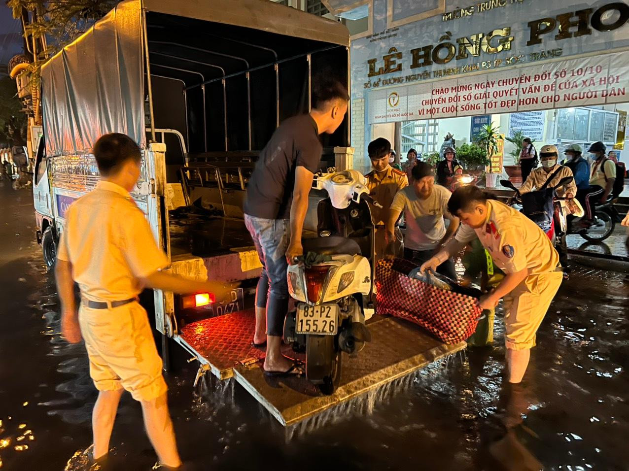 Lãnh đạo Thành ủy Sóc Trăng còn yêu cầu lực lượng cảnh sát giao thông dùng xe tải có hệ thống nâng để đưa xe 2 bánh chết máy ra ngoài. Những xe tải này cũng chở nhiều học sinh ra khỏi vùng ngập.