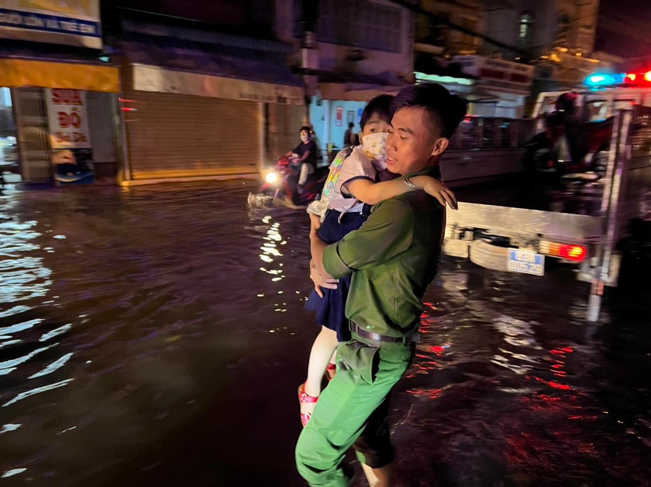Chị Trần Thị Lan, phụ huynh học sinh Nguyễn Trần Thùy Anh (lớp 7/11, trường THCS Lê Hồng Phong) xúc động nói: “Mẹ con tôi bị kẹt từ 16g30 phút vì đường ngập sâu không chạy xe được. May có các chú công an giúp đỡ nên đã thoát khỏi vùng ngập về nhà an toàn”.