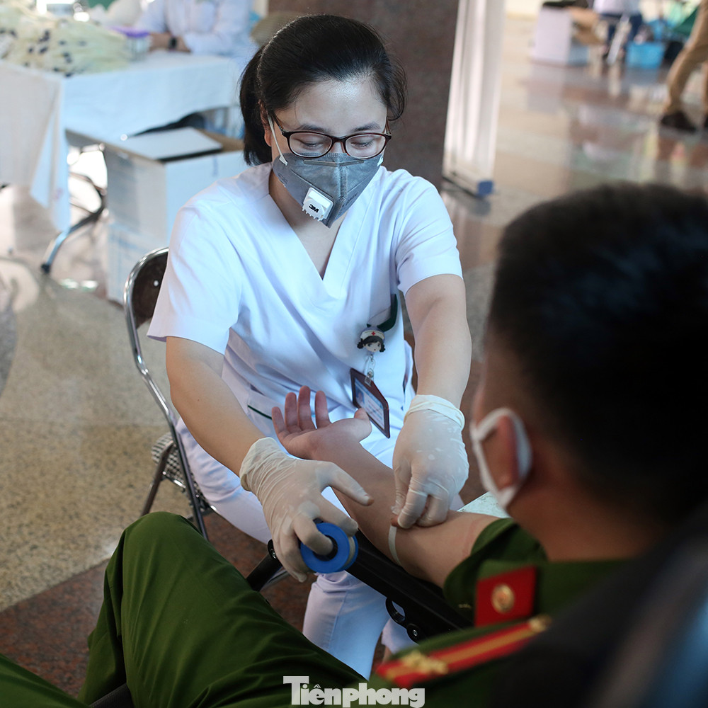 Nhân viên y tế bệnh viện Huyết học và Truyền máu Trung ương đang nhập những dòng máu hồng của các chiến sĩ công an hiến tặng