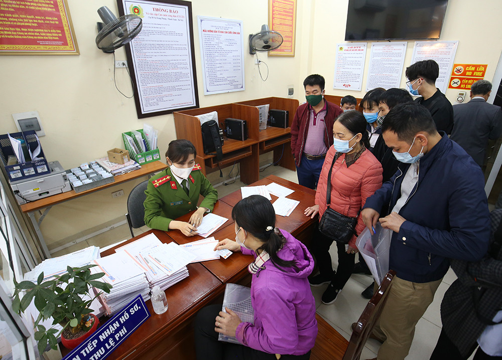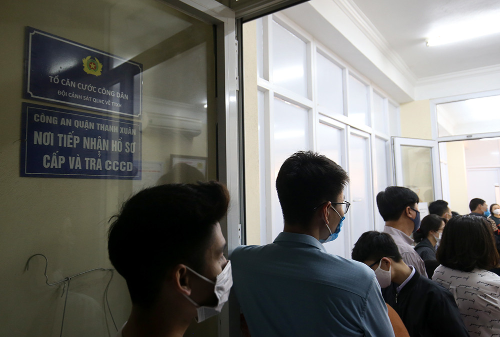 Tại trụ sở của Đội Cảnh sát QLHC và trật tự xã hội, Công an quận Thanh Xuân (số 58 Vũ Trọng Phụng) những ngày này rất đông người dân xếp hàng chờ làm căn cước công dân mới.