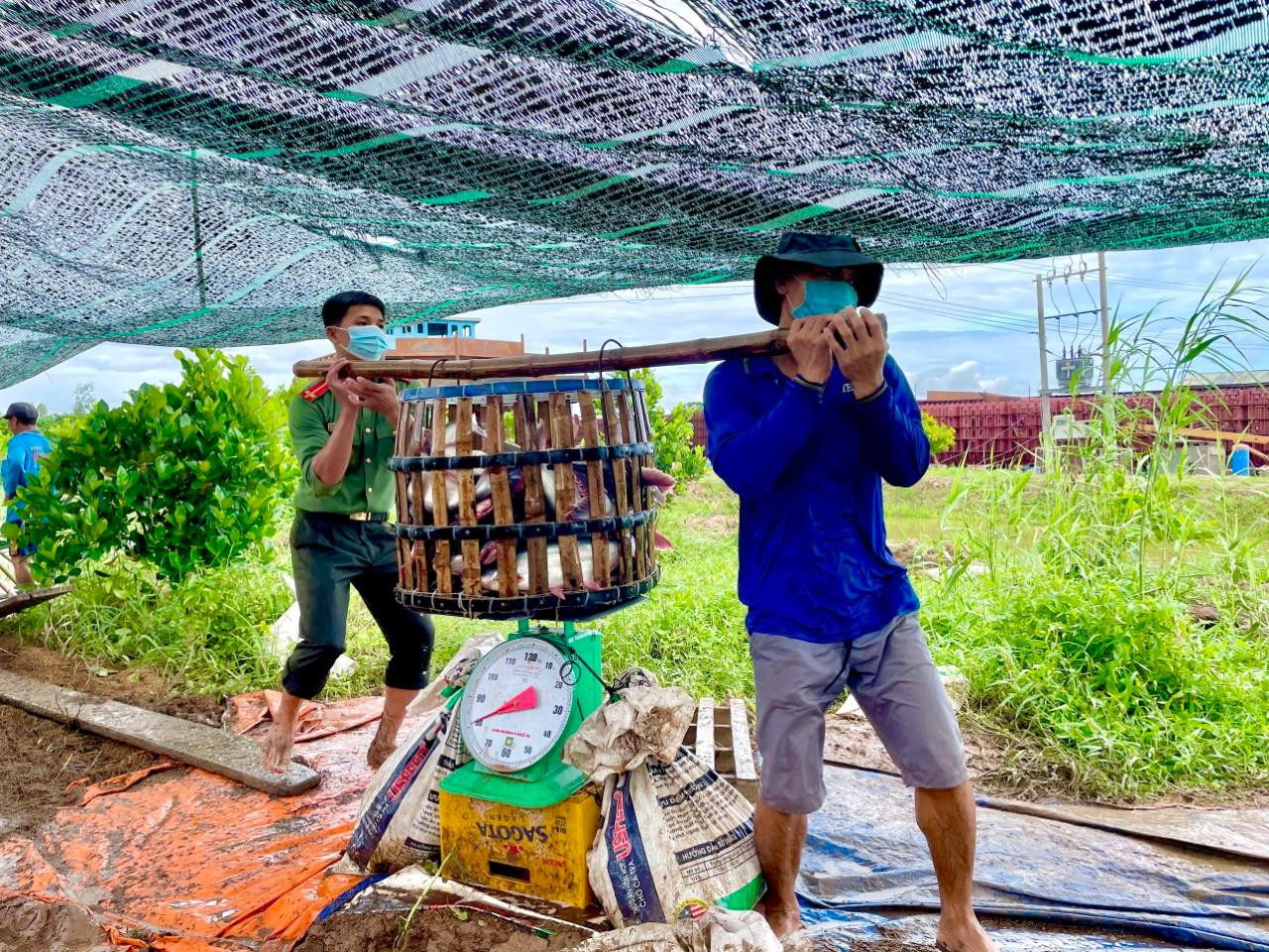 | Các chiến sĩ Công an tỉnh An Giang thu hoạch cá mang đến cho bà con khó khăn trên địa bàn. |