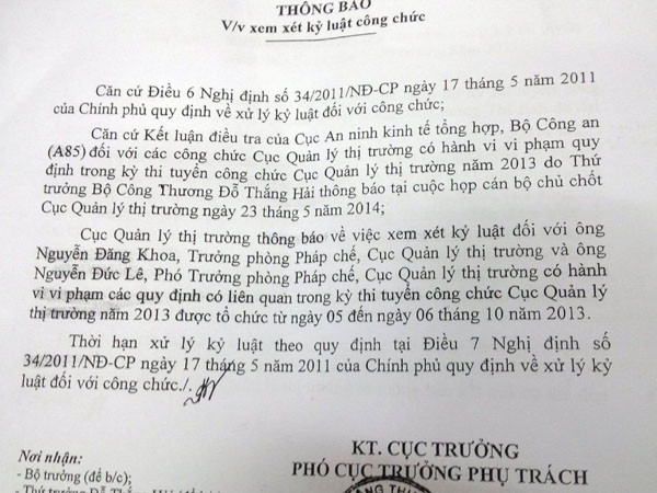 Ông Đỗ Thắng Hải, Thứ trưởng Bộ Công thương vừa có thông báo về việc xem xét kỷ luật đối với ông Nguyễn Đăng Khoa, Trưởng Phòng Pháp chế; Ông Nguyễn Đức Lê, Phó trưởng Phòng Pháp chế (Cục QLTT) có hành vi vi phạm các quy định có liên quan trong kỳ thi tuyển công chức. Thời hạn xử lý kỷ luật theo quy định tại điều 7 Nghị định số 34 ngày 17/5/2011 của Chính phủ quy định về xử lý kỷ luật đối với công chức.