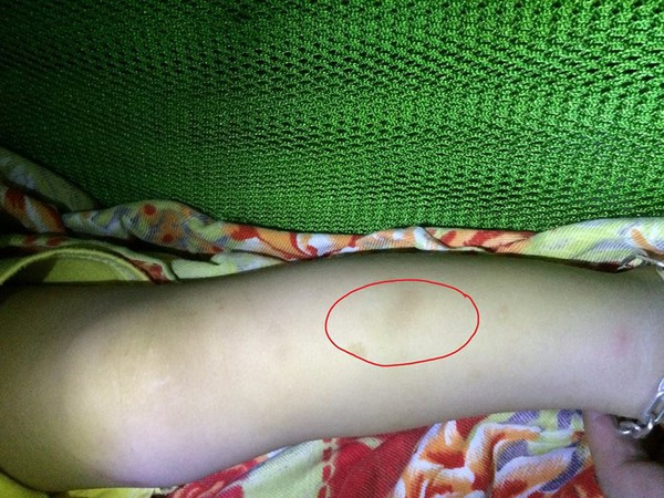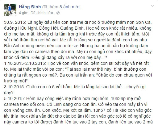 Sang ngày thứ hai, rồi những ngày kế tiếp, con chị vẫn khóc khi đi học về, vẫn tiếp tục xuất hiện những vết thâm tms ở tay chân, đêm ngủ không ngon giấc…"Cho đến hôm nay (3/10/2015) công việc mẹ rảnh hơn mọi hôm. 10h26p mẹ mở camera theo dõi con. Cô Linh đang cho con ăn. Cô véo tai con mấy lần vì con không chịu ăn. Con khóc. Mẹ xót xa lắm. 10h57 cô Hà kéo con vào góc lấy thìa Inox (thìa vẫn đút cho các bé ăn) lôi con vào góc (có lẽ cô nghĩ góc này camera ko tới được) đánh liên tục vào 2 tay con, đánh liên tục vào 2 má con. Mẹ chua xót. Mẹ khóc điện thoại ba con về ngay để lên làm việc với hiệu trưởng. Có lẽ mẹ đã hiểu ra lý do vì sao con hốt hoảng khi ngủ.