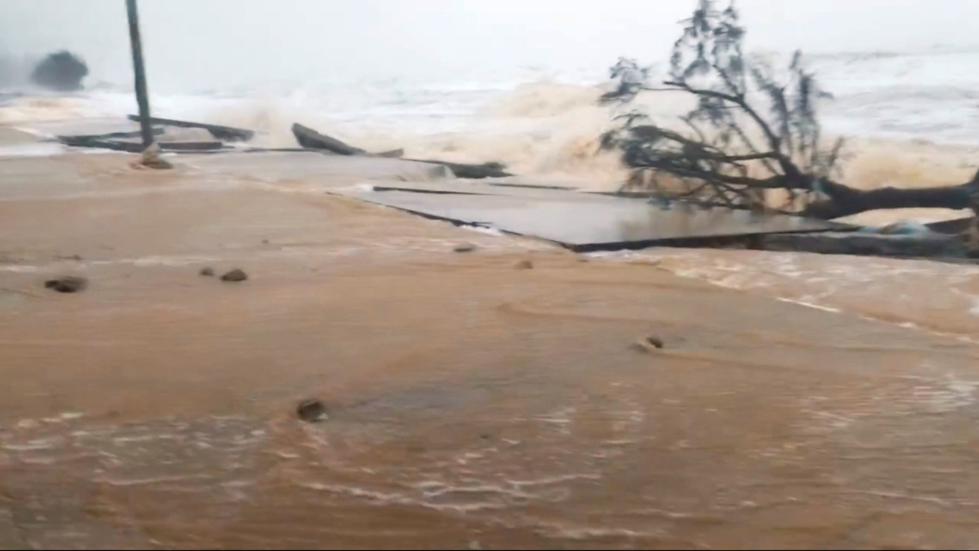 | Nước biển tràn qua bãi tắm ở Phú Vang, xâm nhập sâu vào rừng phi lao phòng hộ bên trong. |
