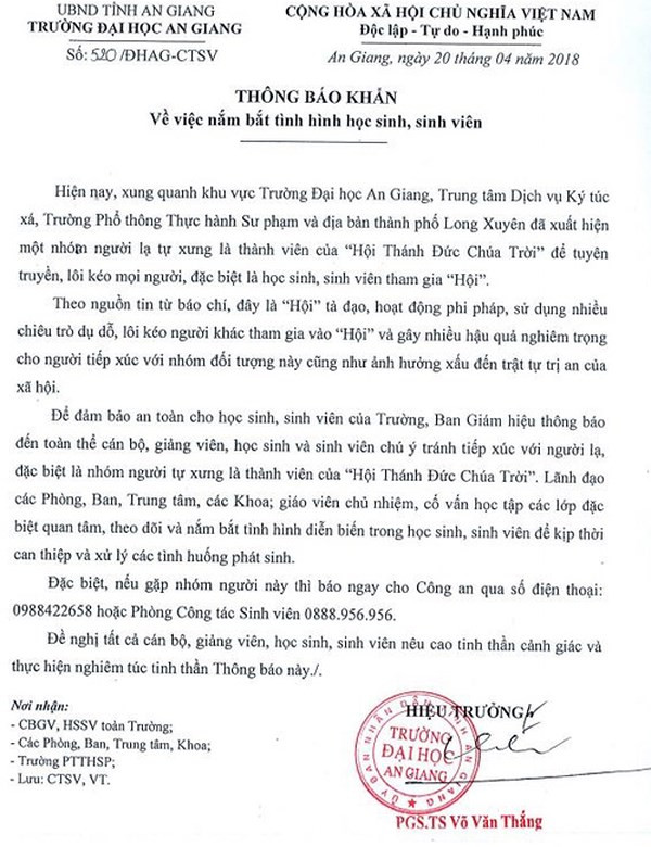 Ngay sau đó, ngày 20/4, Ban giám hiệu phát thông báo yêu cầu sinh viên tránh tiếp xúc với những người tự xưng là thành viên của "Hội thánh Đức chúa trời" này.