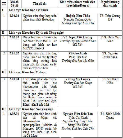 Kết quả, BTC đã trao 10 giải nhất cho các đề tài thuộc các Lĩnh vực Khoa học Tự nhiên; Lĩnh vực Khoa học Kỹ thuật Công nghệ; Lĩnh vực Khoa học Y dược; Lĩnh vực Khoa học Nông nghiệp; Lĩnh vực Khoa học Xã hội và Lĩnh vực Khoa học Nhân văn.