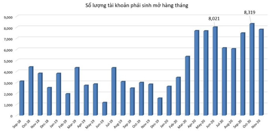Tính đến hết tháng 11/2020, số tài khoản phái sinh đạt 161.992 tài khoản. Trong đó, số lượng mở mới trong năm 2020 là hơn 70.000 tài khoản - mức cao nhất trong vòng 4 năm hoạt động.