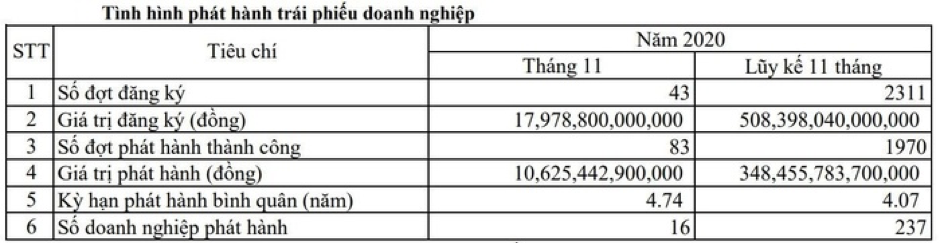 Theo số liệu từ HNX, tính đến hết tháng 11/2020, trên thị trường đã có 2.311 đợt đăng ký phát hành trái phiếu doanh nghiệp riêng lẻ, trong đó có 1.970 đợt phát hành thành công với tổng giá trị phát hành thành công đạt 348.400 tỷ đồng, chiếm 68,5% tổng giá trị đăng ký. Kỳ hạn phát hành bình quân là 4,07 năm. Số doanh nghiệp phát hành thành công là 237 doanh nghiệp, trong đó có 3 doanh nghiệp đã phát hành thành công 185 triệu USD trái phiếu doanh nghiệp ra thị trường quốc tế.