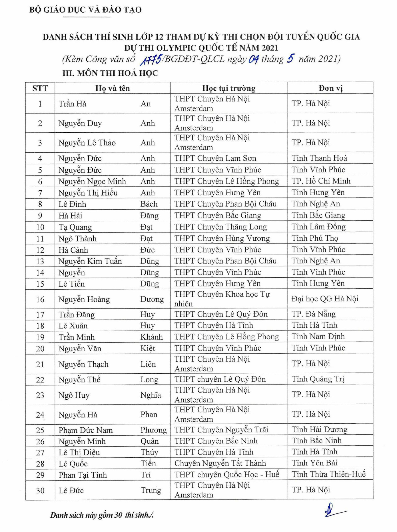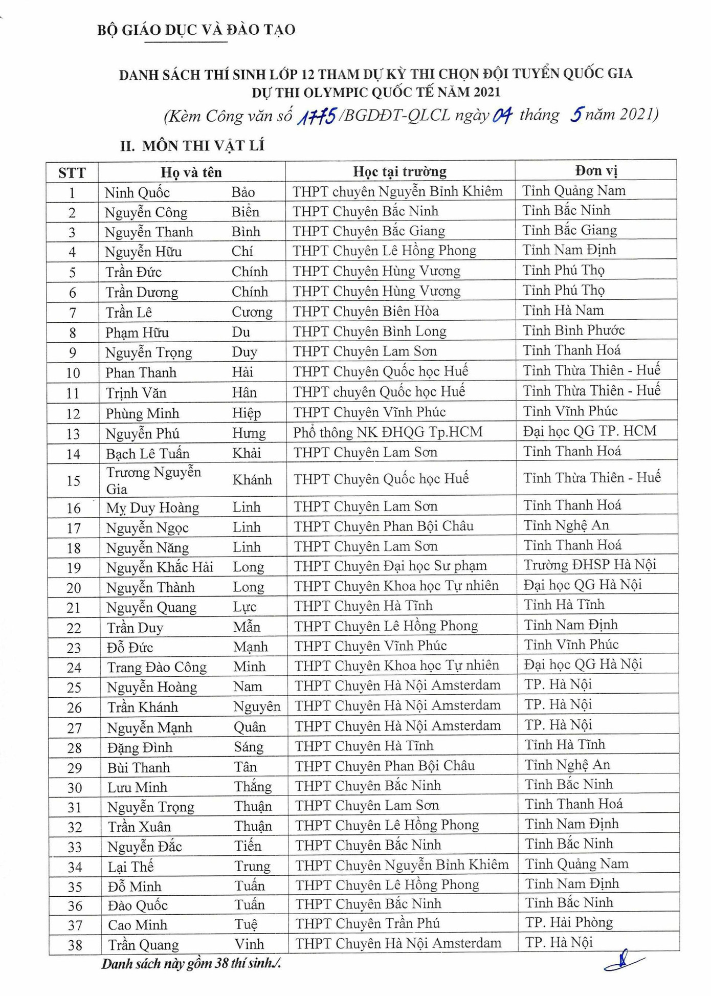 Danh sách các thí sinh gốm: