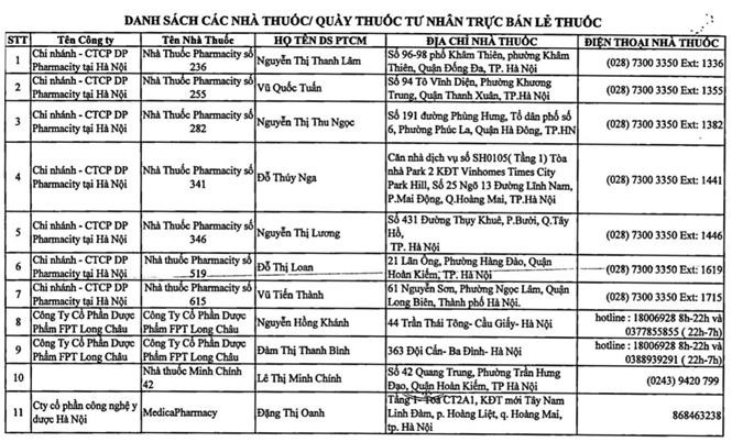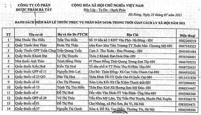 TPO - Ngày 29/7, Sở Y tế Hà Nội công bố 76 điểm bán lẻ thuốc phục vụ người dân trong những ngày Hà Nội thực hiện giãn cách chống dịch. Trong đó có 37 nhà thuốc, quầy thuốc trong bệnh viện; 14 nhà thuốc, quầy thuốc thuộc Công ty cổ phần Dược phẩm Hà Tây; 14 điểm bán thuốc của Công ty cổ phần Dược phẩm và Thiết bị y tế Hà Nội và 11 nhà thuốc, quầy thuốc tư nhân.