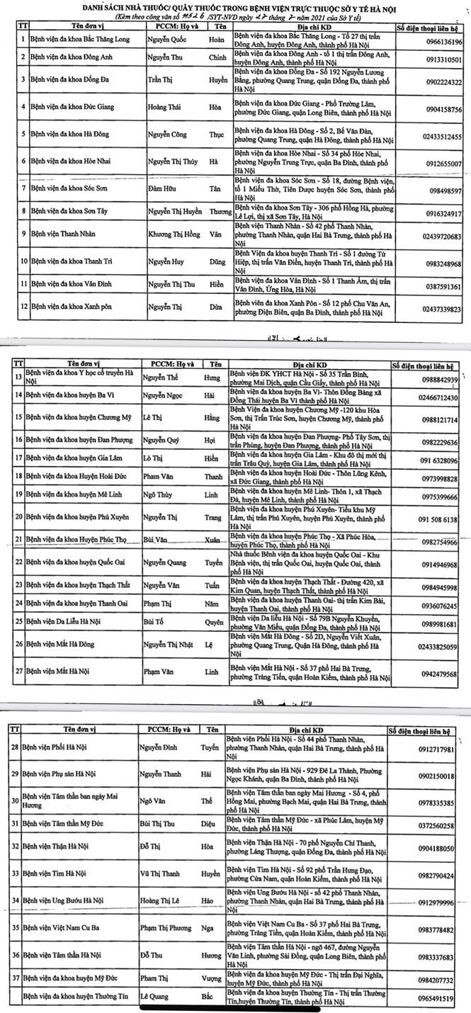 Sở Y tế Hà Nội đề nghị, các bệnh viện trực thuộc ngành Y tế Thủ đô, Công ty cổ phần Dược phẩm và Thiết bị y tế Hà Nội, Công ty cổ phần Dược phẩm Hà Tây tăng cường nguồn cung, dự trữ đầy đủ thuốc. Đồng thời, các nhà thuốc, quầy thuốc bố trí cán bộ trực bán thuốc 24/24 giờ để phục vụ người dân trong những ngày thực hiện giãn cách xã hội.