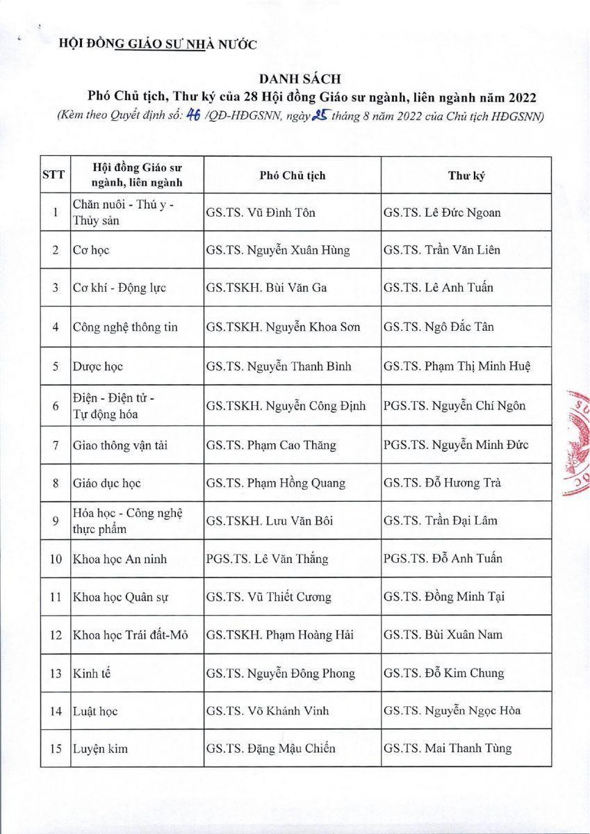 Theo đó, danh sách Phó Chủ tịch, Thư ký của 26 Hội đồng Giáo sư (HĐGS) ngành/chuyên ngành như sau: