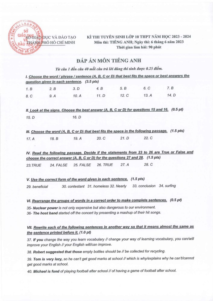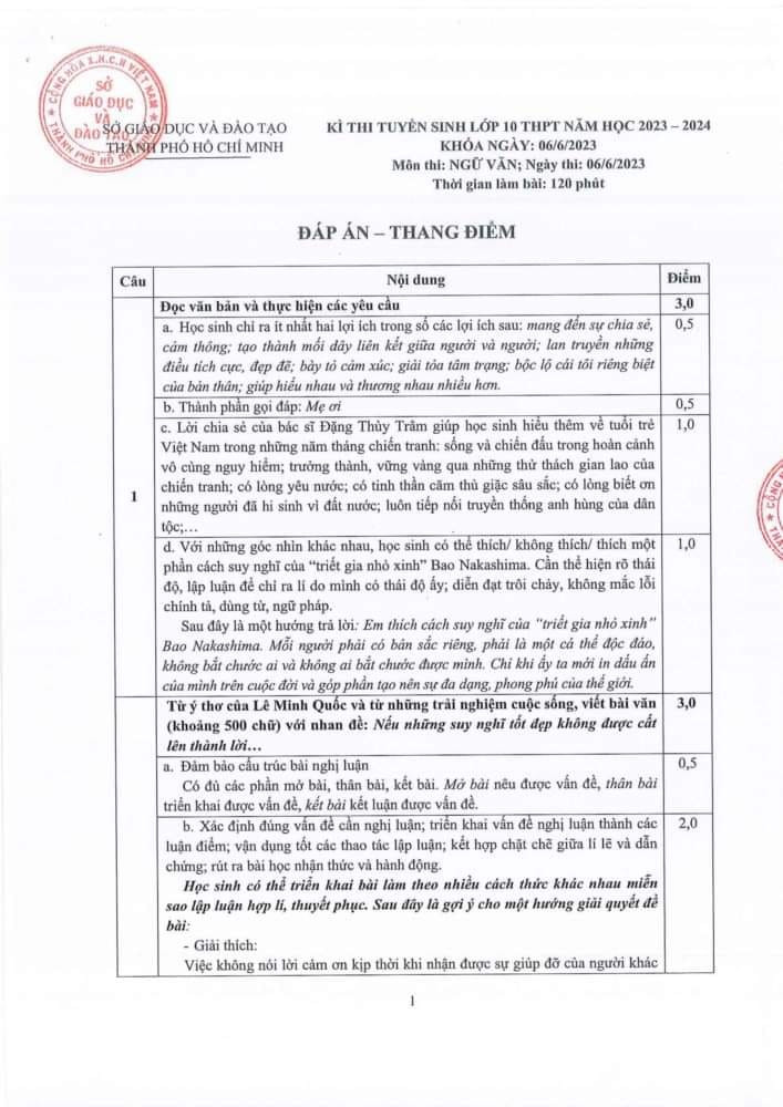 | Đáp án chính thức môn Ngữ Văn tuyển sinh 10 TP.HCM năm 2023. |