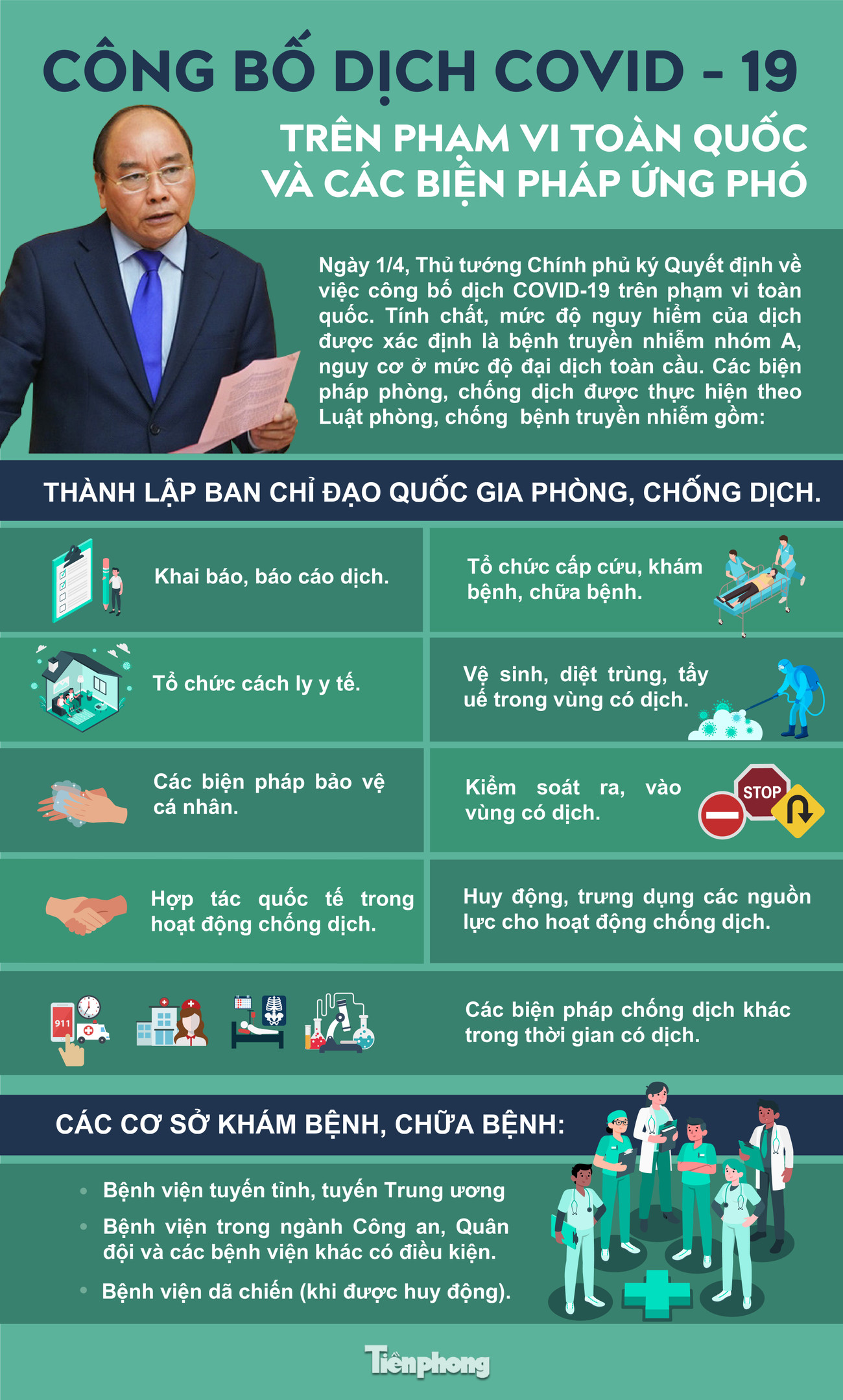 TPO - Ngày 1/4, Thủ tướng Chính phủ ký Quyết định về việc công bố dịch COVID-19 trên phạm vi toàn quốc. Tính chất, mức độ nguy hiểm của dịch được xác định là bệnh truyền nhiễm nhóm A, nguy cơ ở mức độ đại dịch toàn cầu.