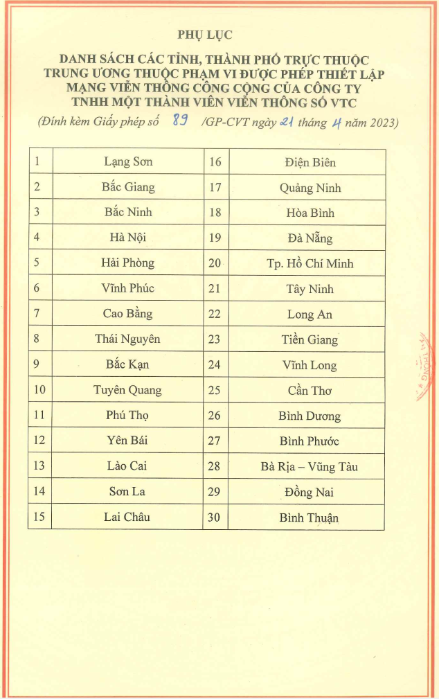 CÔNG TY TNHH MỘT THÀNH VIÊN VIỄN THÔNG SỐ VTC được cấp Giấy phép kinh doanh dịch vụ viễn thông và xin công bố các Giấy phép với những nội dung sau: