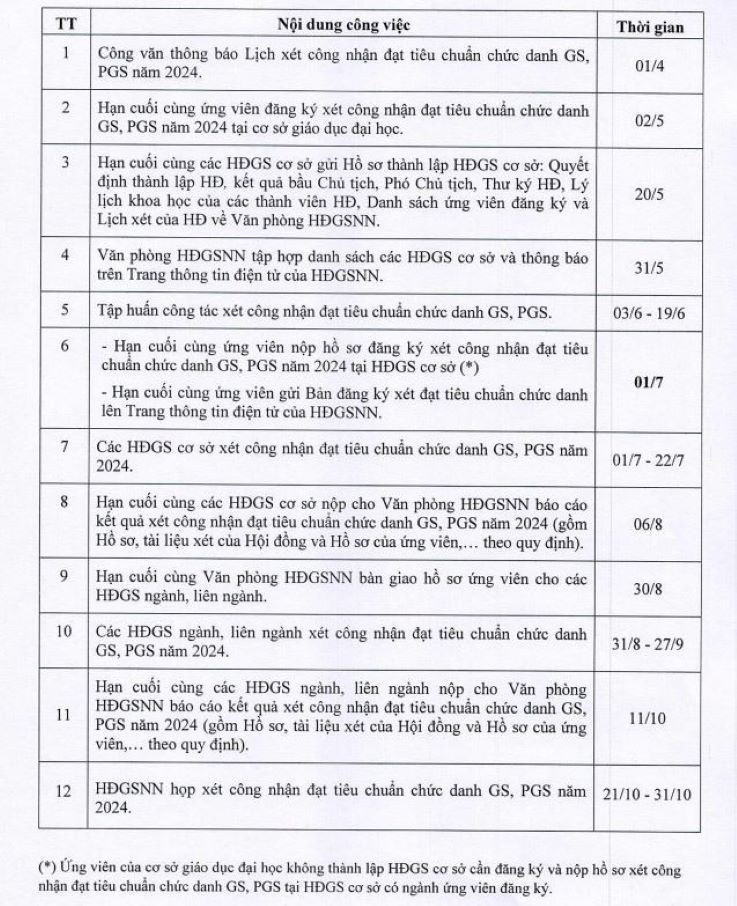 Ngày 1/7 là hạn cuối cùng ứng viên nộp hồ sơ đăng ký xét công nhận đạt tiêu chuẩn chức danh GS, PGS năm 2024 tại Hội đồng cơ sở; hạn cuối ứng viên gửi bản đăng ký xét đạt tiêu chuẩn chức danh lên trang thông tin điện tử của Hội đồng Giáo sư Nhà nước.