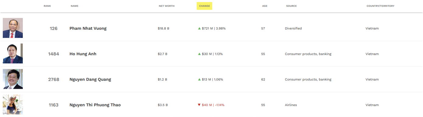 Cập nhật mới nhất từ Forbes ghi nhận Việt Nam hiện có 5 tỷ phú USD, gồm ông Phạm Nhật Vượng - Chủ tịch Tập đoàn Vingroup, bà Nguyễn Thị Phương Thảo - Chủ tịch Hội đồng quản trị Công ty CP Hàng không Vietjet kiêm Phó Chủ tịch HDBank, ông Trần Đình Long - Chủ tịch Hội đồng quản trị Tập đoàn Hòa Phát, ông Hồ Hùng Anh - Chủ tịch Hội đồng quản trị Techcombank và ông Nguyễn Đăng Quang - Chủ tịch Hội đồng quản trị Masan Group.