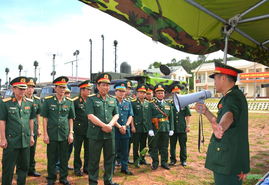 | Lãnh đạo Cục Tác chiến điện tử-Bộ Tổng Tham mưu Quân đội nhân dân giới thiệu một số trang bị kỹ thuật của Lữ đoàn Tác chiến điện tử 96. |