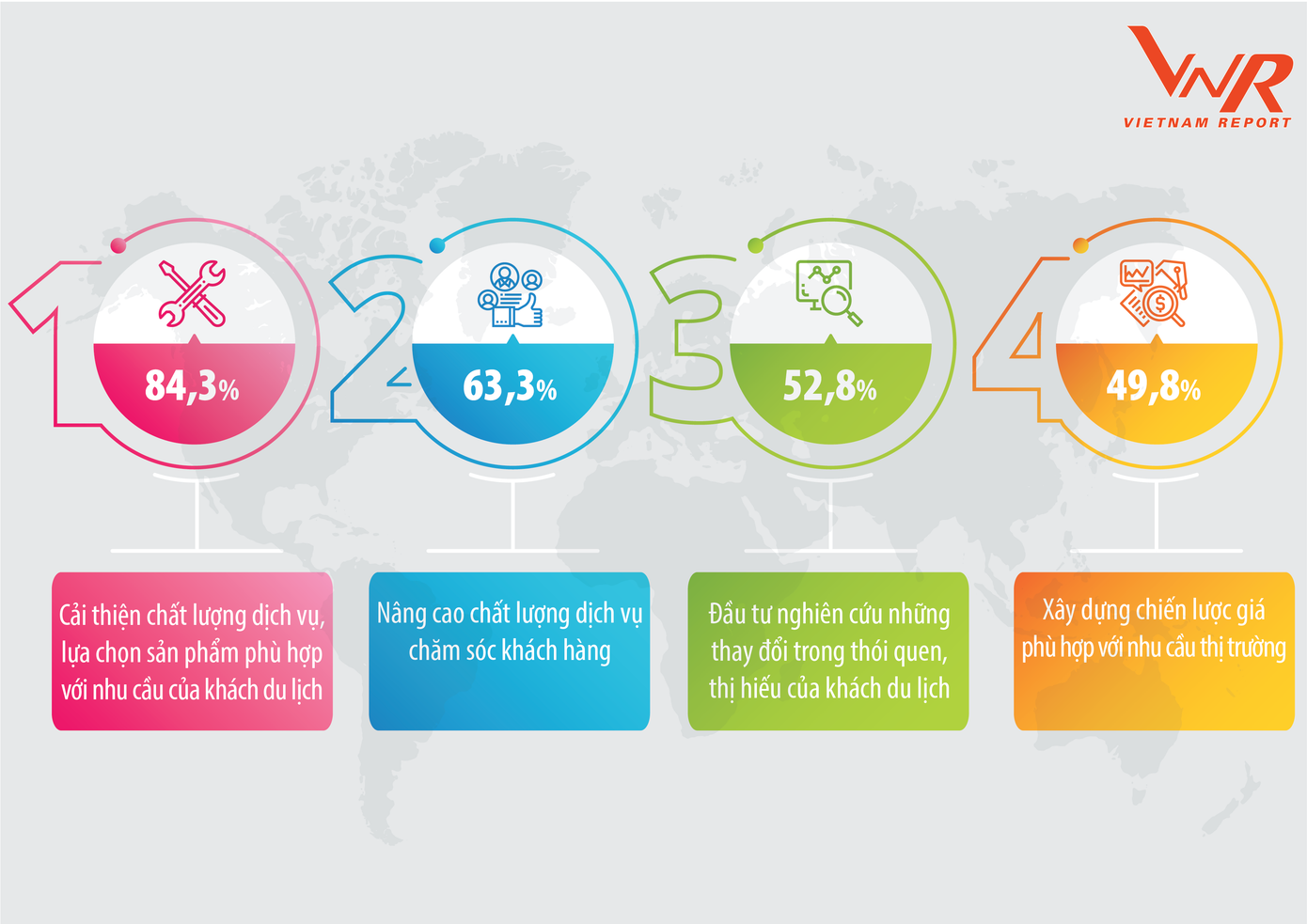 Ngoài ra, các doanh nghiệp cần chú trọng đầu tư nghiên cứu những thay đổi trong thói quen và thị hiếu của khách du lịch (52,84%), xây dựng chiến lược giá phù hợp với nhu cầu thị trường (49,78%).