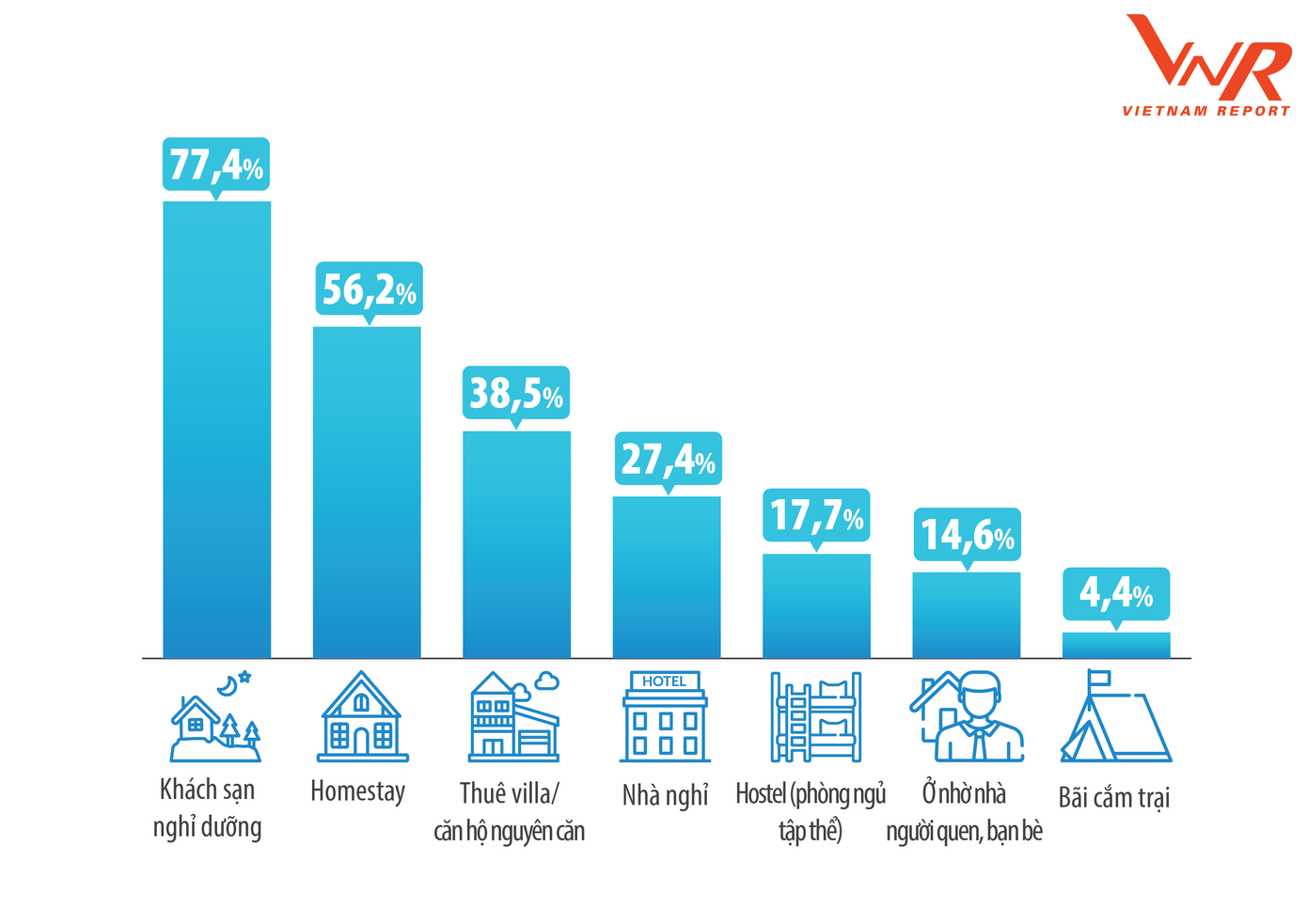 Cùng với sự phát triển của công nghệ, khách du lịch ngày càng có sự đa dạng trong lựa chọn phòng nghỉ. Bên cạnh lựa chọn hình thức khách sạn nghỉ dưỡng (chiếm tỷ lệ 77,43%), thì loại hình homestay ngày càng được ưa chuộng (56,19%), bởi có nhiều ưu điểm như chi phí rẻ, tiện nghi, không gian sáng tạo và tiện nghi.