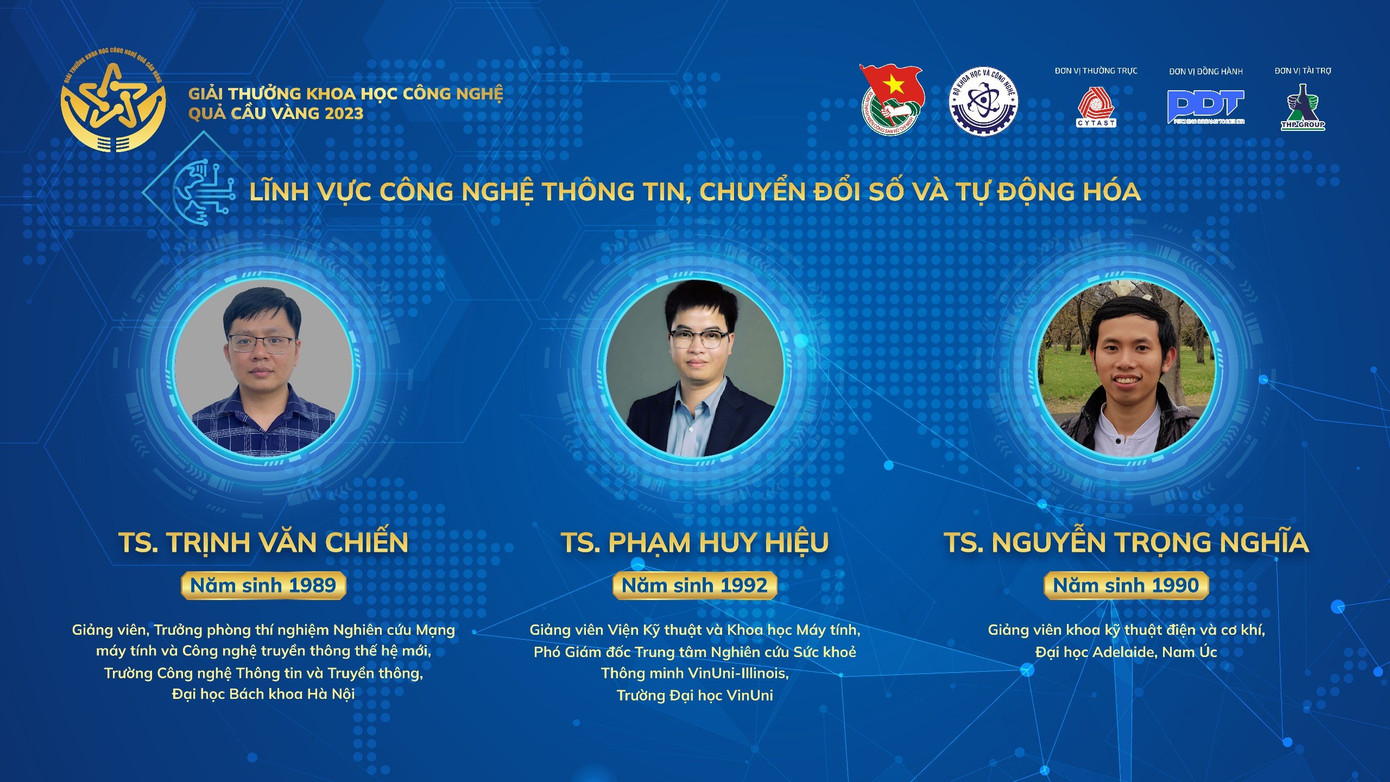 1. TS Trịnh Văn Chiến, 34 tuổi, giảng viên, trưởng phòng thí nghiệm nghiên cứu mạng máy tính và công nghệ truyền thông thế hệ mới, trường Công nghệ thông tin và Truyền thông (ĐH Bách khoa Hà Nội), với nghiên cứu xem xét việc tích hợp công nghệ cực nhiều ăng ten trong mạng phi tế bào và bề mặt phản xạ thông minh dưới ảnh hưởng của tương quan không gian giữa các phần tử tán xạ.