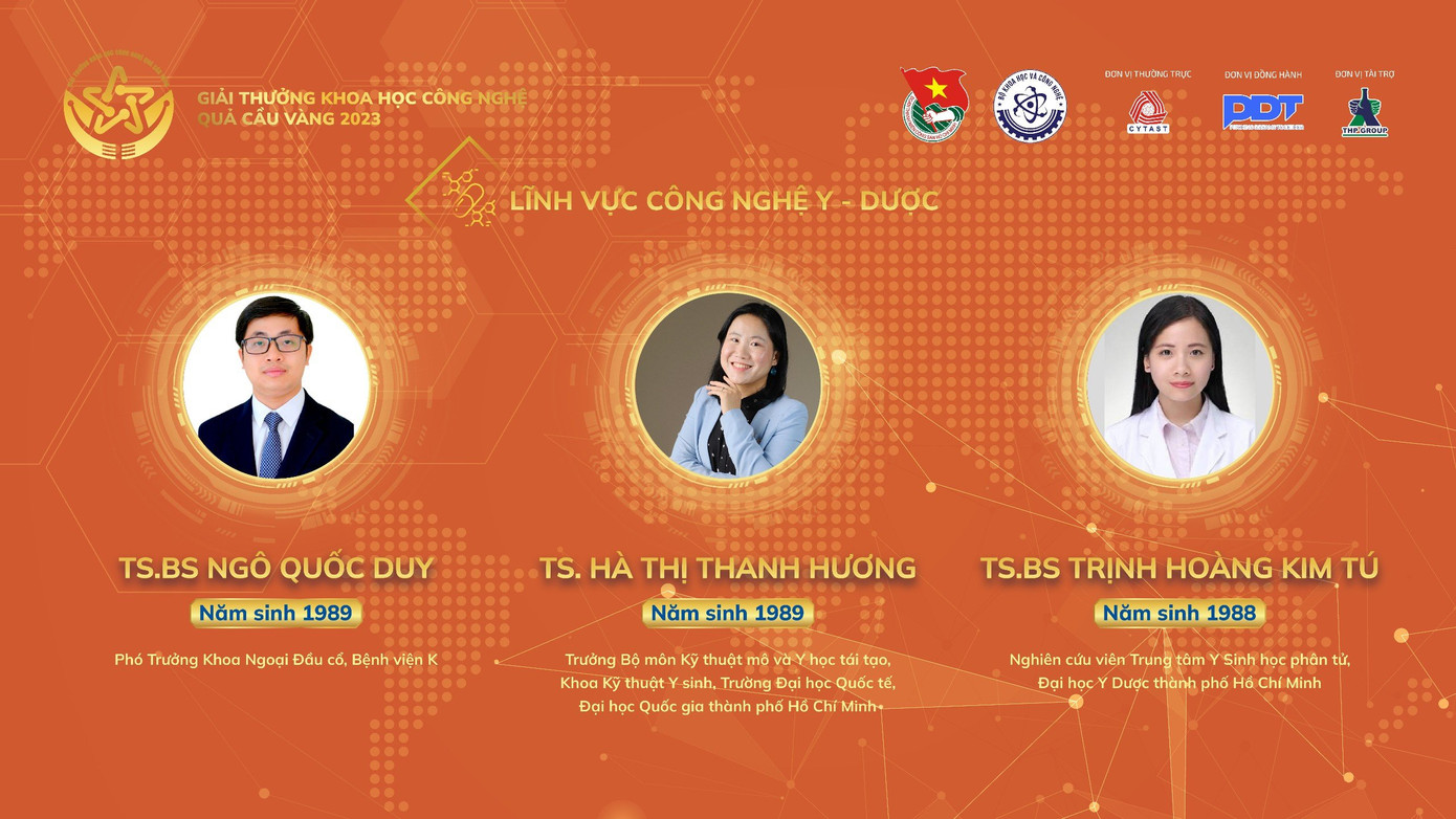 4. TS.BS Ngô Quốc Duy, 34 tuổi, phó trưởng khoa ngoại đầu cổ, Bệnh viện K, nghiên cứu phát triển kỹ thuật phẫu thuật nội soi cắt tuyến giáp qua tiền đình miệng thông qua ứng dụng kỹ thuật trong nạo vét hạch cổ bên điều trị ung thư tuyến giáp.