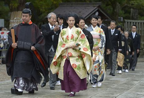 Công chúa Noriko kết hôn với giáo sĩ Kunimaro Senge, con trai cả của người đứng đầu ngôi đền lớn Izumo Taisha tại tỉnh Shimane hôm 5/10.