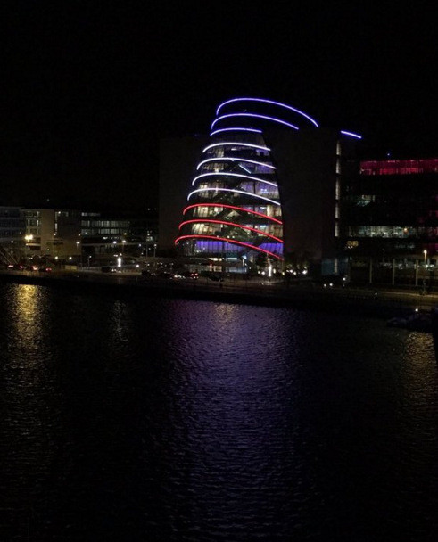 Khách sạn Omni Hotel tại Dallas (Mỹ) thay đổi màu đèn chiếu sang màu quốc kì Pháp.