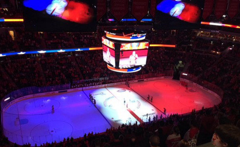 Trước một trận đấu mới đây của giải khúc côn cầu quốc gia National Hockey League tại Mỹ, mặt băng của sân Washington Capitals cũng đã được chiếu hình quốc kì Pháp.