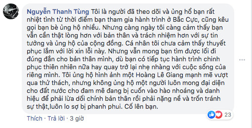 Trước bài đăng xin lỗi của Giang, nhiều bình luận đã thể hiện sự cảm thông về lỗi lầm và khen ngợi tinh thần dũng cảm nhận sai.