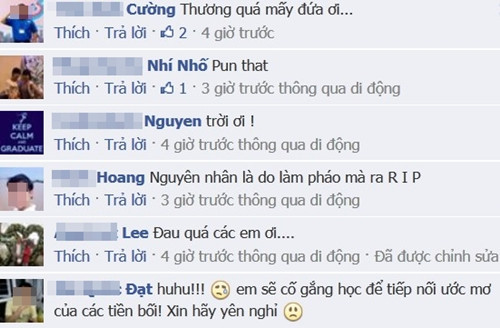 Số khác thì vừa xót xa vừa giận về hành động này: “Thật đau lòng khi nghe tin. Vừa thương vừa trách về hành động dại dột này. Các bạn nghĩ sao mà lại chế pháo trong phòng trọ chật hẹp như vậy chứ”, Pham Tính nói.