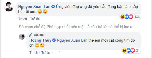 Đàn chị Xuân Lan là người đầu tiên nhận thấy sự "bất ổn" trong phần yêu cầu tuyển dụng của đàn em, nên cũng để lại một vài lời "nhắc khéo" Hoàng Thùy: "Ứng viên đáp ứng đủ yêu cầu đang bận làm sếp hết rồi em".