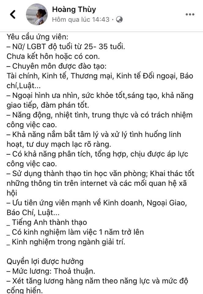Tuy nhiên, bỏ qua những yêu cầu cốt lõi như ngoại hình, bằng cấp, kinh nghiệm, thì danh sách tiêu chí tuyển dụng của Hoàng Thùy được cho là quá cao và khá gắt gao. Điều này đã ngay lập tức thu hút sự chú ý của người hâm mộ và vấp phải không ít ý kiến trái chiều từ dư luận.