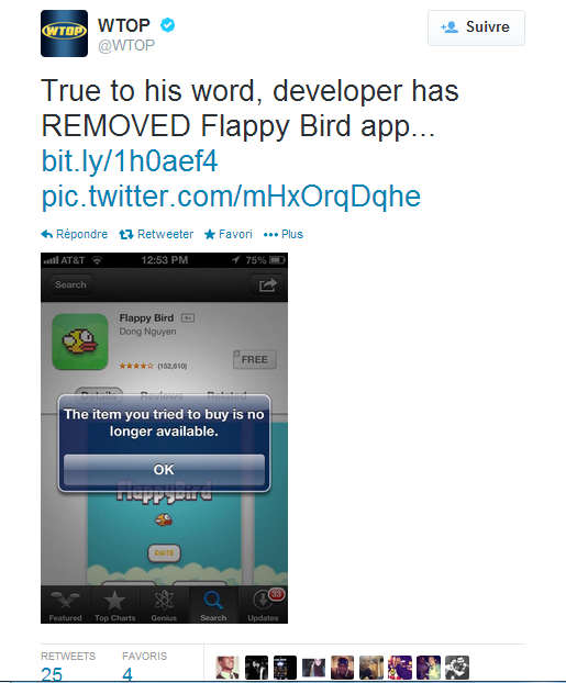 Không riêng những người hâm mộ trong nước, sự biến mất của Flappy Bird cũng là đề tài nóng trên cộng đồng Twitter và Facebook ngoài nước. Nhiều người không tin đây là sự thật và cố gắng đợi đến thời điểm mà tác giả thông báo gỡ trò chơi.