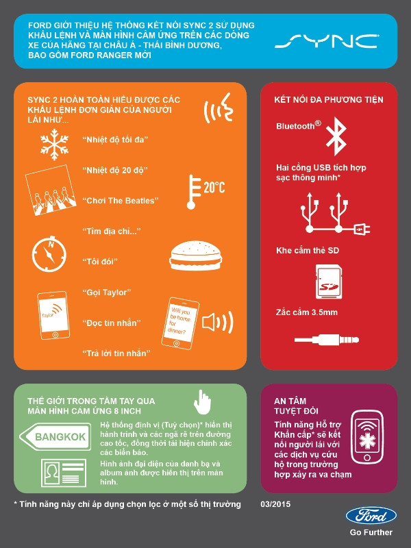 Ford Ranger vừa trang bị hệ thống kết nối SYNC 2 qua Bluetooth để việc giữ liên lạc của người lái xe trở nên dễ dàng hơn.