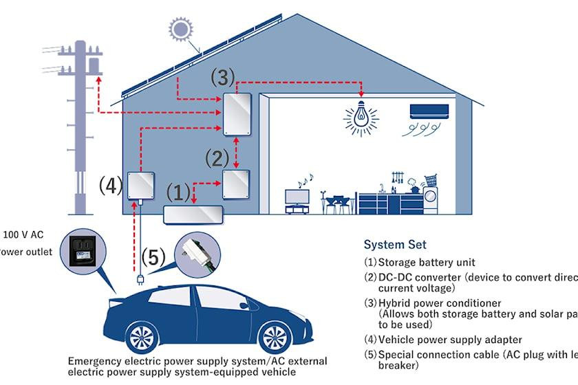 Hệ thống O-Uchi Kyuden của Toyota tại Nhật Bản được thiết kế để hỗ trợ việc sử dụng điện gia đình cả trong điều kiện bình thường và trong trường hợp khẩn cấp. Pin 8,7 kWh có thể cung cấp điện cho cả nhà khi cúp điện, đồng thời có thể tích trữ lượng điện dư thừa do các tấm pin mặt trời tạo ra. Hệ thống pin cũng có thể kết nối với các loại xe hybrid, plug-in hybrid, xe điện hoặc pin nhiên liệu để bổ sung năng lượng cho nó. Điều này tương tự như những gì Ford đã chế tạo với mẫu bán tải điện F-150 Lightning và F-150 PowerBoost.