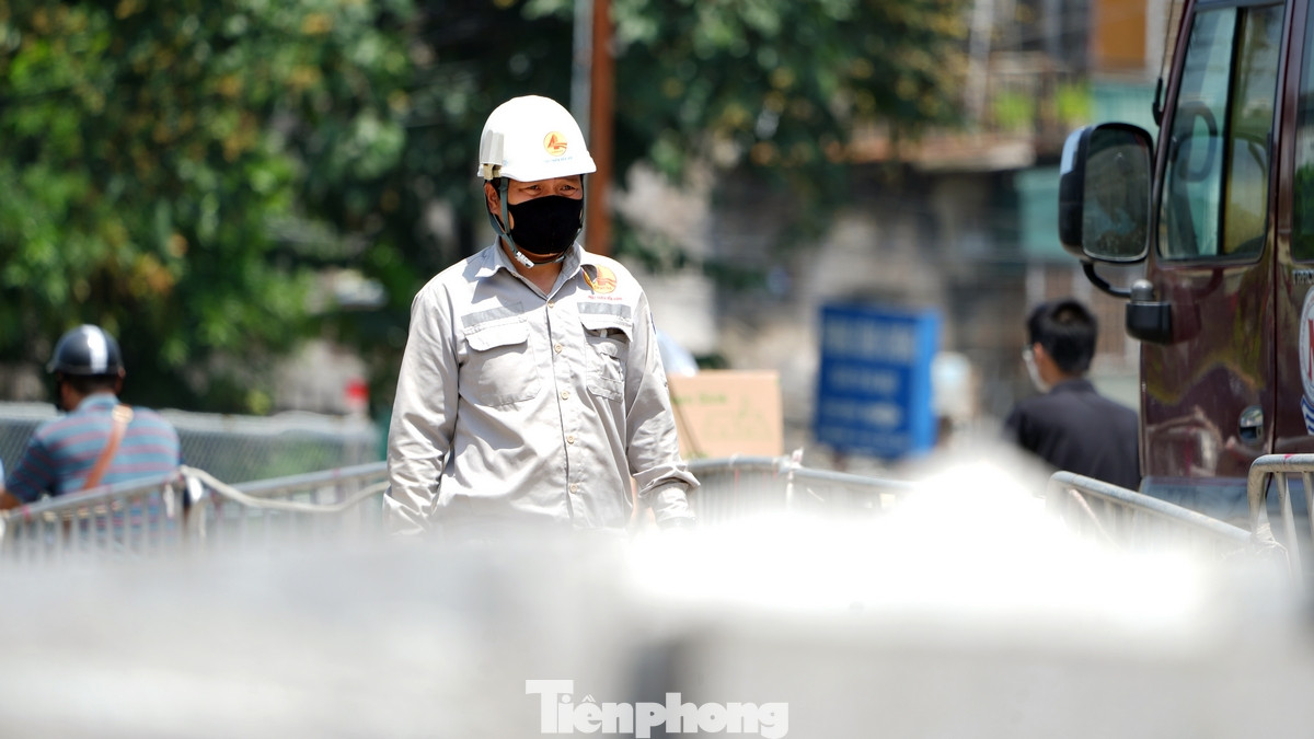 | Công nhân đang nỗ lực làm việc dù thời tiết nắng nóng gay gắt để đảm bảo tiến độ của nhà thầu. Dự kiến tháng 8 sẽ xong hạng mục cầu đỡ và tiến hành thi công hạng mục hầm kín nằm dưới đường sắt bên dưới ga Giáp Bát. |