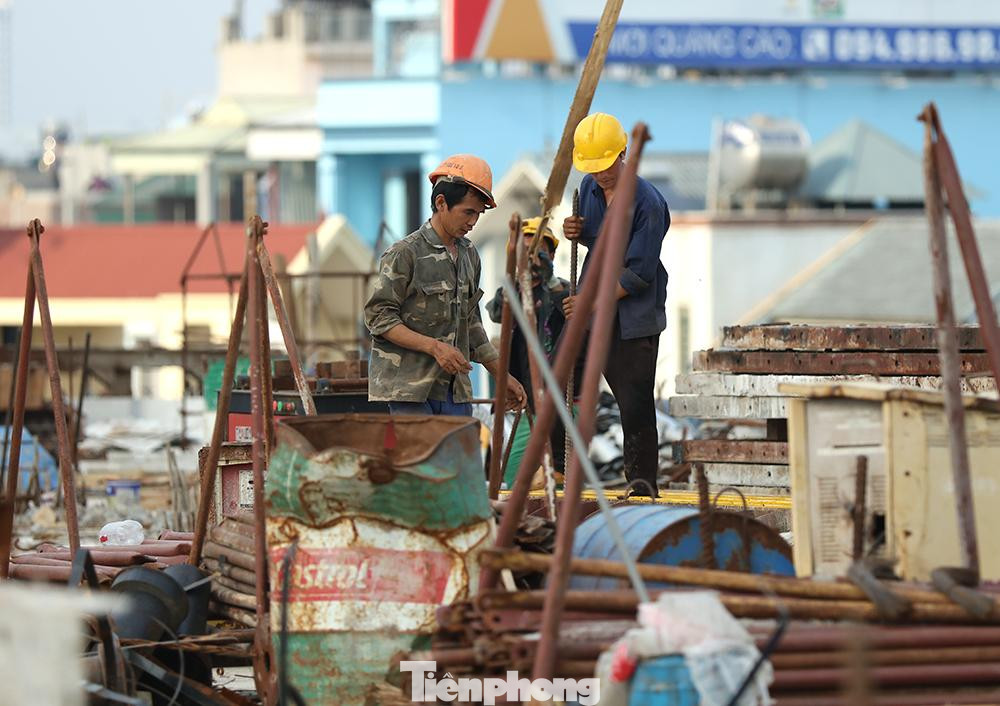 | Để đẩy nhanh tiến độ, liên danh nhà thầu đang huy động 500 công nhân làm việc ba ca, 10 sà lan, 1.000 tấn vật liệu trên sông |