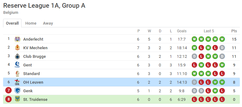 Bảng xếp hạng bảng A giải dự bị Bỉ.