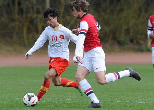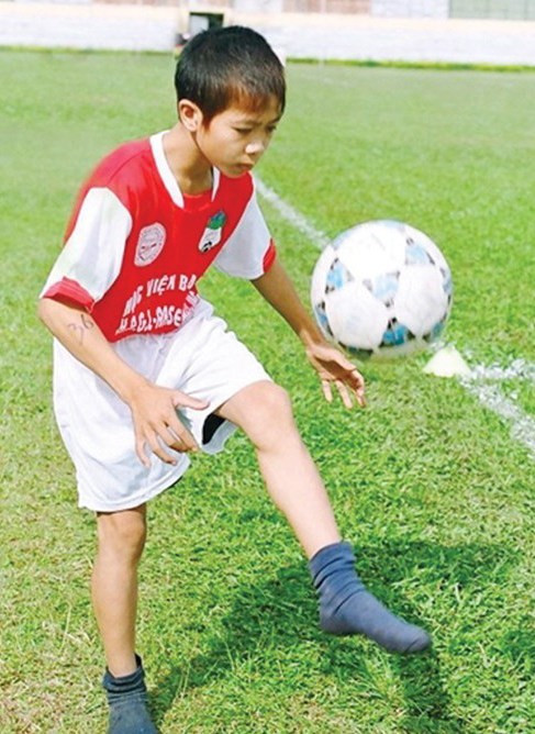 Công Phượng với mái tóc vàng vì cháy nắng khéo léo thể hiện kỹ thuật với bóng bằng chân đất và là 1 trong 5 em trúng tuyển vào khóa I Học viện HAGL Arsenal-JMG.
