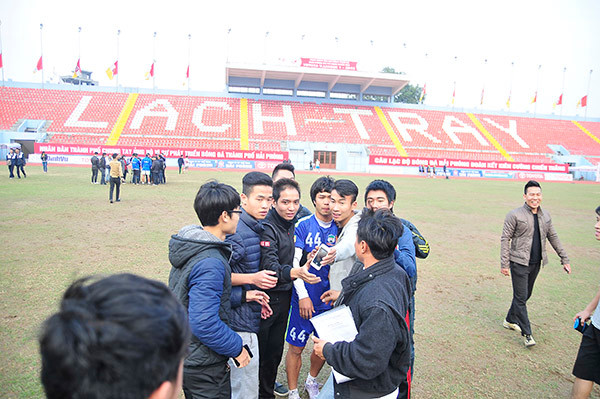 Sau buổi tập của HAGL trên sân Lạch Tray chiều nay, nhiều CĐV đất Cảng đã xuống sân bao vây các ngôi sao đội bóng phố Núi như Công Phượng, Xuân Trường, Tuấn Anh để xin chữ ký hoặc chụp ảnh cùng.
