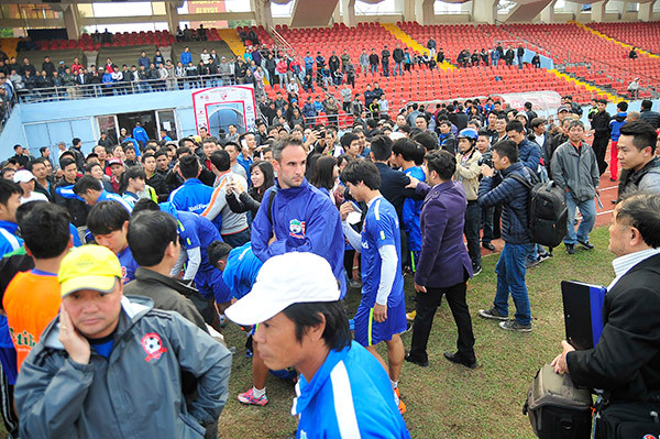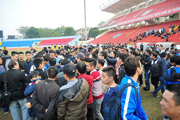 Nhiều CĐV tràn xuống sân sau khi HA Gia Lai kết thúc buổi tập.