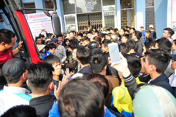 Sau khi xuống xe, Công Phượng và đồng đội đã bị CĐV Hải Phòng vây quanh.