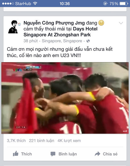 Hạnh phúc vì nhận được nhiều lời khen ngợi, chúc mừng của giới chuyên môn, CĐV nhưng với những bài học trong quá khứ, tiền đạo xứ Nghệ vẫn giữ được thái độ chừng mực trước muôn vàn lời tung hô. Trên trang cá nhân của mình, Công Phượng chia sẻ rất thật như thể nhắn nhủ tới CĐV: “Cảm ơn tất cả mọi người nhưng giải đấu vẫn chưa kết thúc. Cố lên nào anh em U.23 Việt Nam…”.