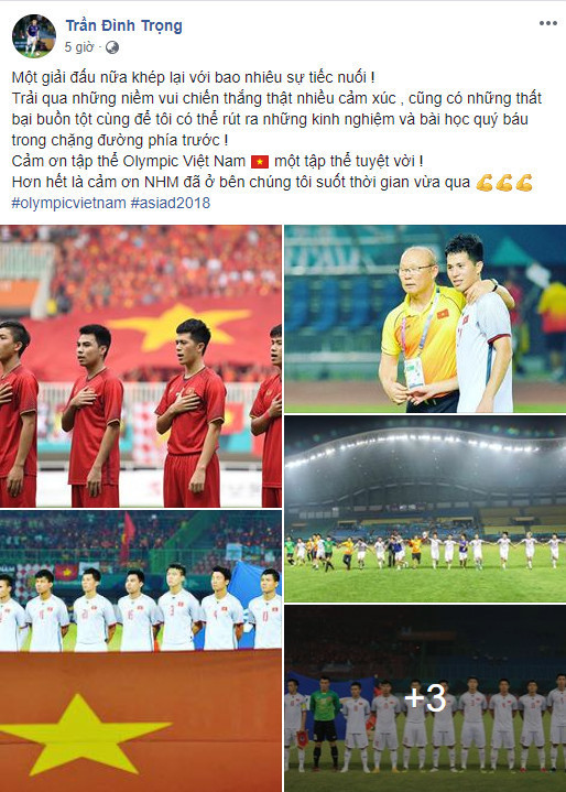 Trung vệ của CLB Hà Nội cũng tỏ ra đầy tiếc nuối trước thất bại của đội nhà. Trong sơ đồ 3 hậu vệ của HLV Park, Đình Trọng đóng vai trò quan trọng khi thi đấu ở giữa, ngay trước mặt thủ thành Bùi Tiến Dũng. Ở trận tứ kết gặp Olympic Syria, việc thiếu vắng Đình Trọng đã gây không ít khó khăn cho các cầu thủ Việt Nam.