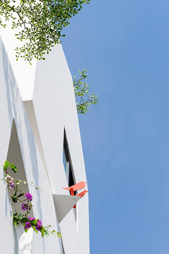 Nếu như gam màu trắng giúp ngôi nhà phố nổi bật thì các mảng màu trừu tượng tạo điểm nhấn khác lạ cho mặt đứng công trình.